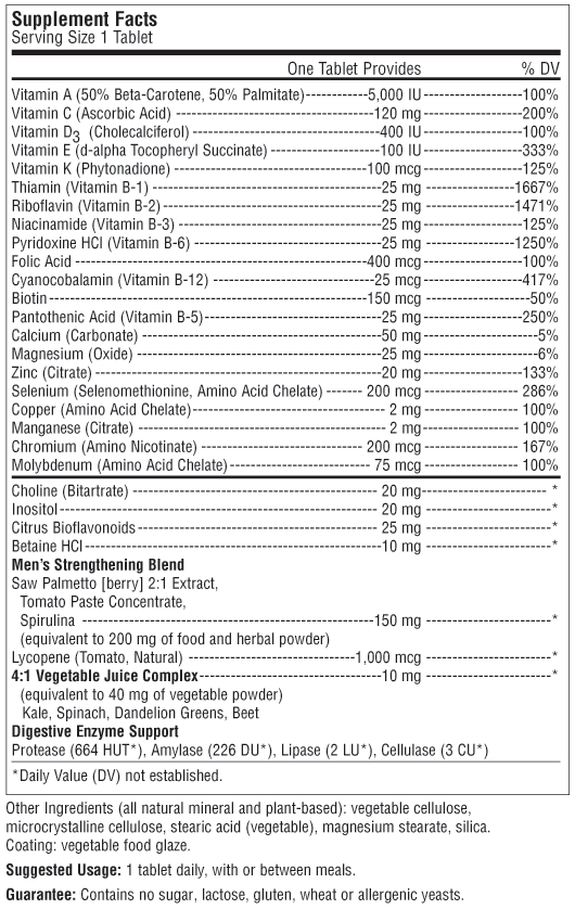 Just Once Men's One Multivitamin RAI709 - 30 Tabs - $12.95 RAI710 - 90 Tabs - $29.95 Buy Now Men's One™ Multivitamin Potent & Science-Safe Gentle on the Stomach 100% Natural Targeted, iron-free nutrition that meets men’s special needs, delivering a balanced profile of essential nutrients and featuring extra support for reproductive health with high-potency zinc plus Saw Palmetto, commonly known as “the prostate herb” View Nutritional Facts *These statements have not been evaluated by the Food and Drug Administration. This product is not intended to diagnose, treat, cure or prevent any disease.